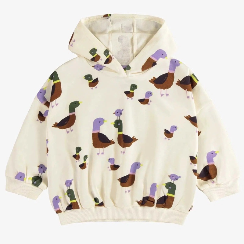 Cream hoodie with cross neck and long sleeves in a duck family pattern, purple headed females and green headed males. Loose and puffy fit with regular length.