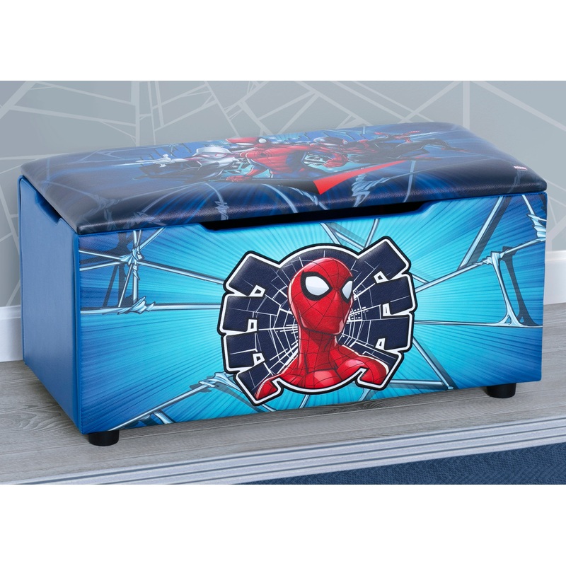 Your favorite web slinger will be on the cleanup job in the playroom, bedroom or living room with this Spider-Man Upholstered Toy Box/Bench with Lid by Delta Children. The bold, 3D appliqued details, durable wood frame and fully upholstered construction ensures its built to last. The spacious interior can fit toys, blankets, games and more! Thoroughly tested for safety, this toy box doubles as a bench that will be ideal at the foot of your childs bed or anywhere else in the house an extra seat is needed. This toy box perfectly coordinates with other Spider-Man furniture and dcor products from Delta Children.