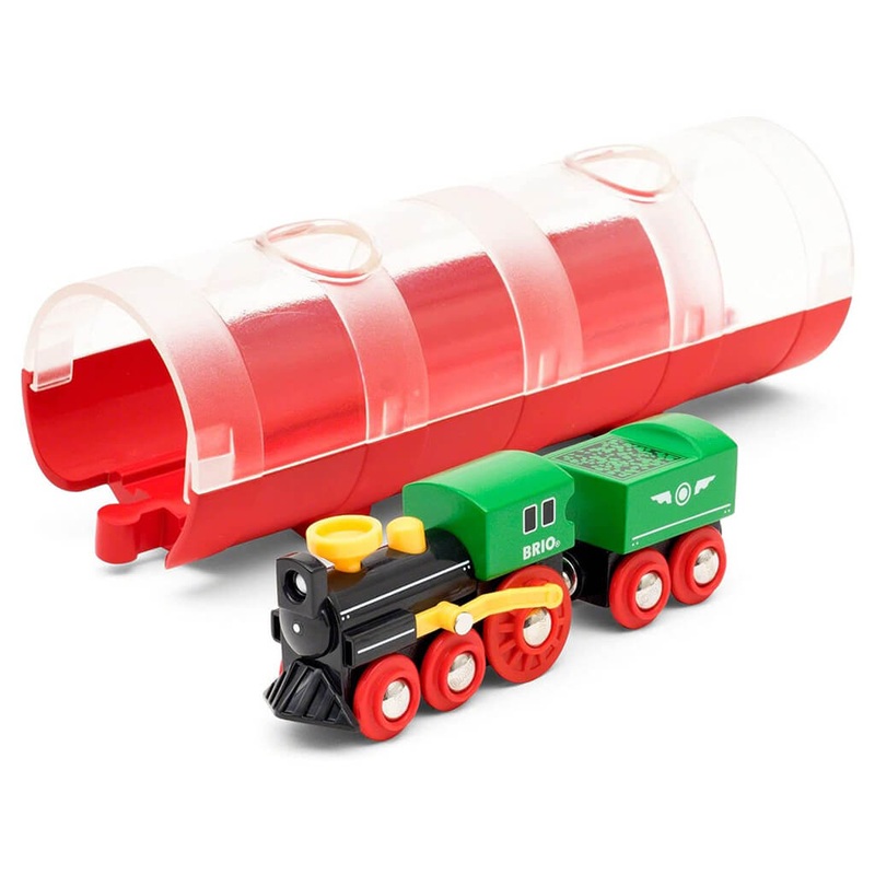 The BRIO World Steam Train & Tunnel is beautifully crafted with a classic design and wooden details. The golden age of the toy train is back as this handsome steam engine and wagon chuffs and chugs around your BRIO World wooden railway. The clever packaging around the steam engine also transforms into a stylish see-through tunnel.