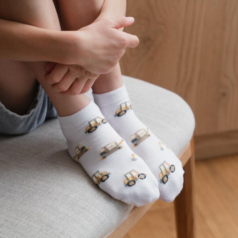 Wonderful and stylish white socks with a fashionable excavator pattern made of soft fabric. This comfortable product is a great complement to your everyday outfits.