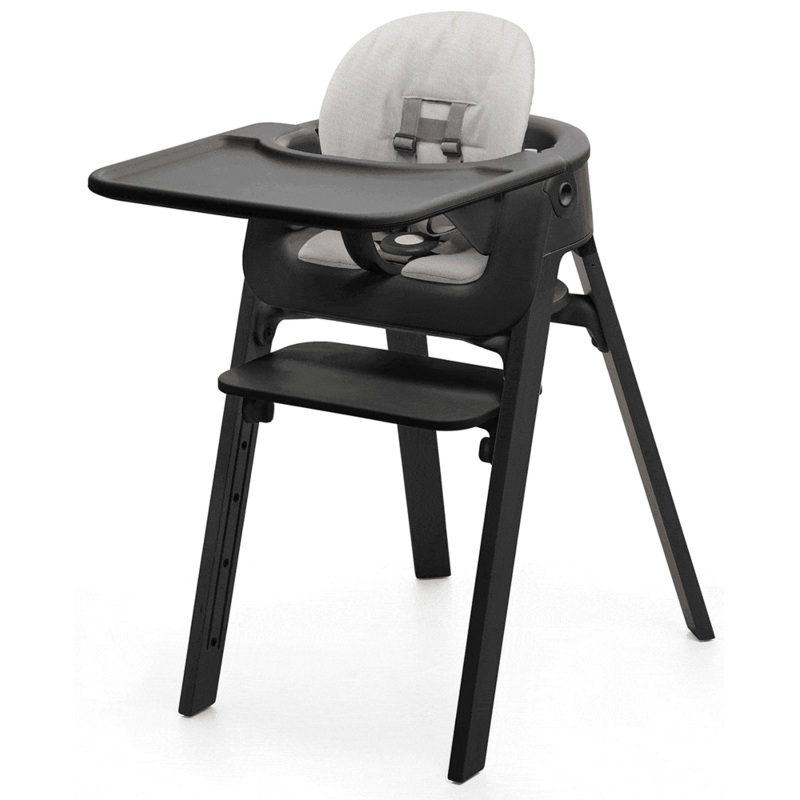 Optional accessories transform the Stokke Steps Chair into a seating solution that can be used from birth with the Bouncer, bringing your newborn to the table and with the Stokke Steps Baby Set to create the highchair.