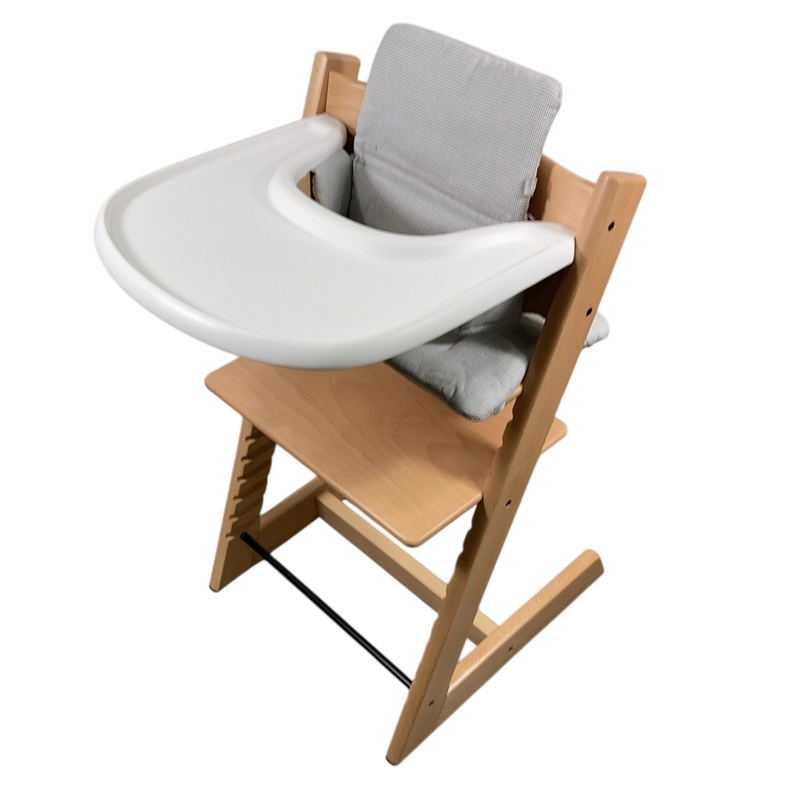 Condition: Gently Used Experience the ultimate in child dining solutions with the Stokke Tripp Trapp Complete High Chair. As your child grows, so does the chair, thanks to its adjustable seat and footplate. The included Baby Set provides support for your l