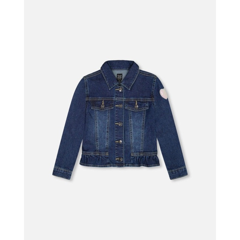 Our Stretch Denim Jacket with Unicorn is the versatile outer layer she’ll want to wear with every outfit! In stretch cotton/poly denim, this long sleeve jacket features front buttons, two front flap pockets, and a ruffled hem that makes it extra-sweet. A shimmering heart on the sleeve and a giant winged unicorn on the back make it simply adorable from every angle.