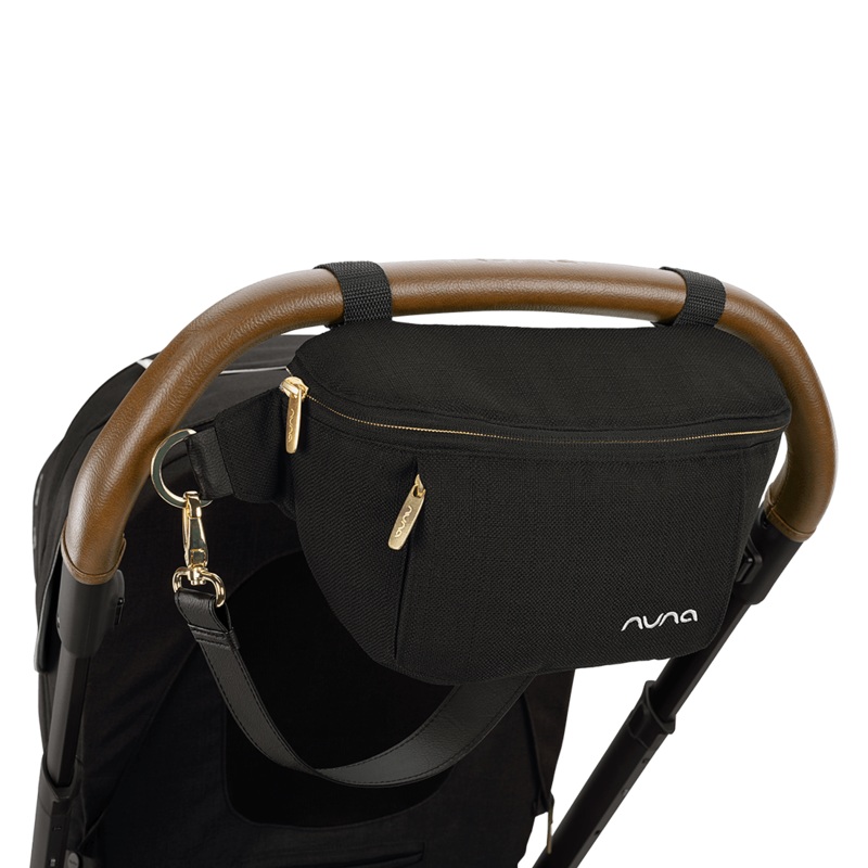 Keep it in reach while on the go. Small in size but big on detail, the Nuna stroller sling bag has six inside compartments and two outside for easy access to essentials. Compatible with all Nuna strollers (except the TRVL and TRIV next) it easily attaches to the push bar, keeping it organized and in reach. A luxe leatherette carry strap quickly converts it to an over-the-shoulder tote bag. Just attach or remove and go.