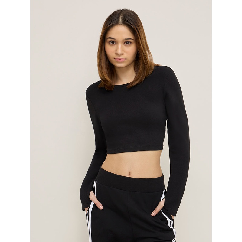 This black top from Studiofit is crafted from pure-cotton for uninterrupted comfort. Showcasing a cut-out design at the back for added appeal, it is fitted with a crewneck and full sleeves.