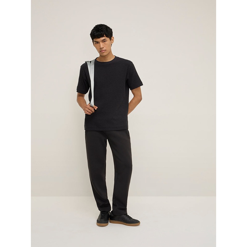 This black t-shirt from Studiofit is fashioned from a self-textured fabric with a round neck and half sleeves. Its breathable composition ensures easy comfort.