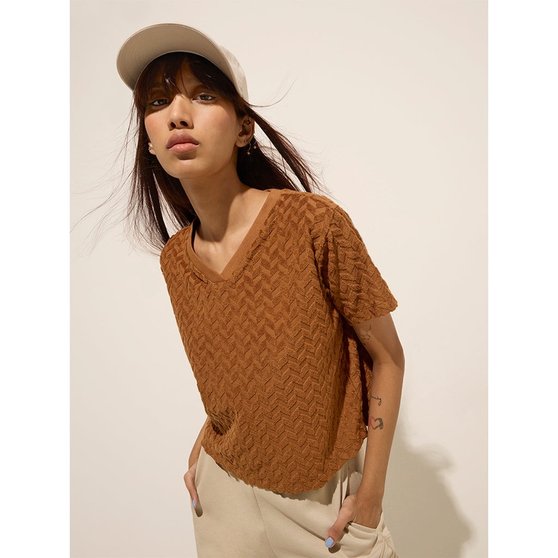 Studiofit introduces this chevron-textured top in a brown hue. Crafted from a blended-cotton fabric, it boasts a V-neckline and short sleeves.