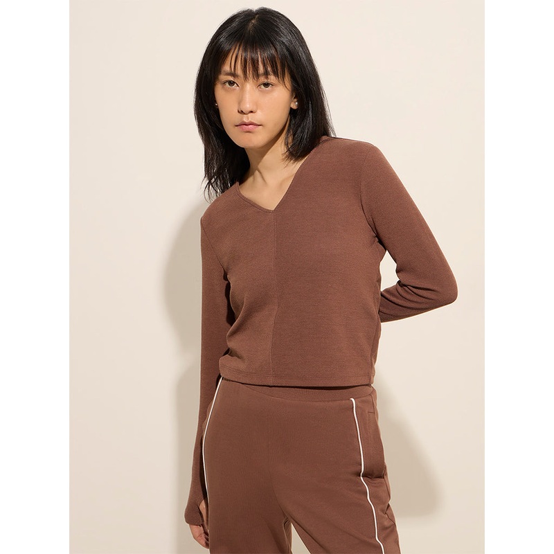 Studiofit launches this brown top in pure cotton composition. It carries V-neck and full sleeves design.