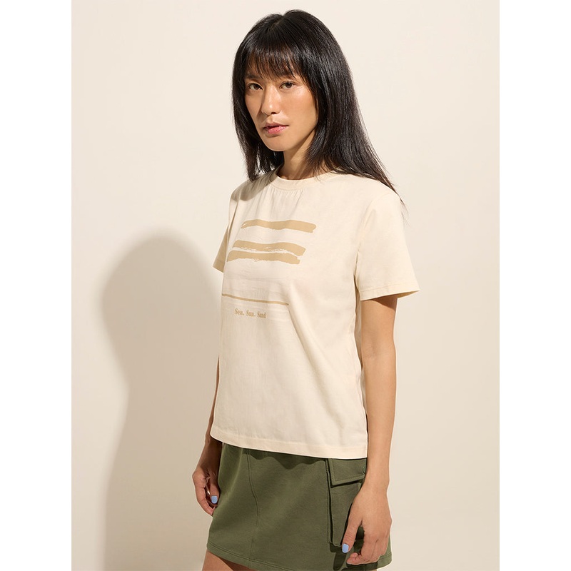 This cream t-shirt by Studiofit boasts printed addition. The pure cotton garment carries a round neck and short sleeves.