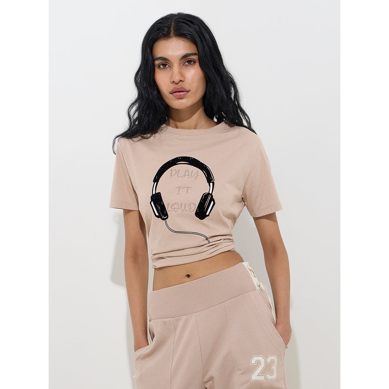 Studiofit Light Beige Headphone Printed Cotton T-Shirt