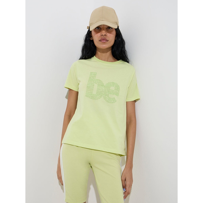 Make a bold statement with this lime cotton T-shirt by Studiofit, featuring eye-catching text print for a trendy edge. Designed for all-day comfort, it comes with a ribbed round neck and half sleeves, making it a vibrant addition to your casual wardrobe.