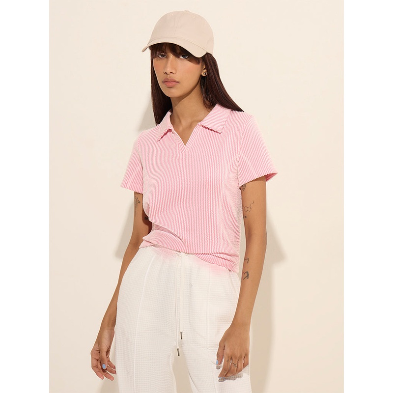 Studiofit launches this polo t-shirt in pink shade. It showcases textured stripes and includes a V-neck collar with short sleeves.