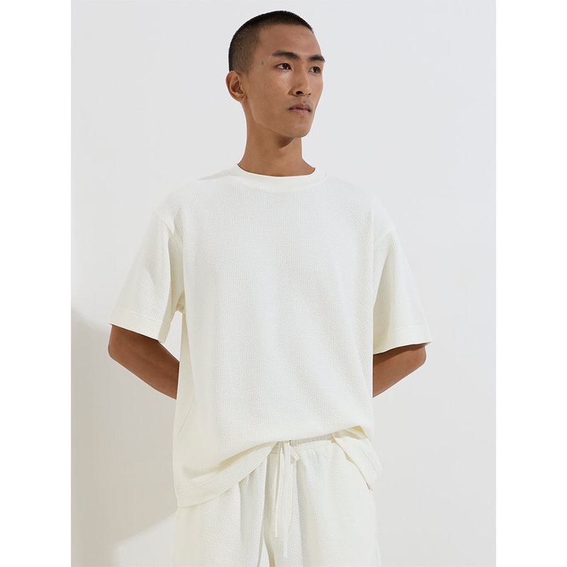 This white t-shirt by Studiofit is fashioned with textured addition. Carved in a relaxed-fit frame, it includes a crew neck and half sleeves. The pure cotton build of this activewear ensures a comfortable experience.