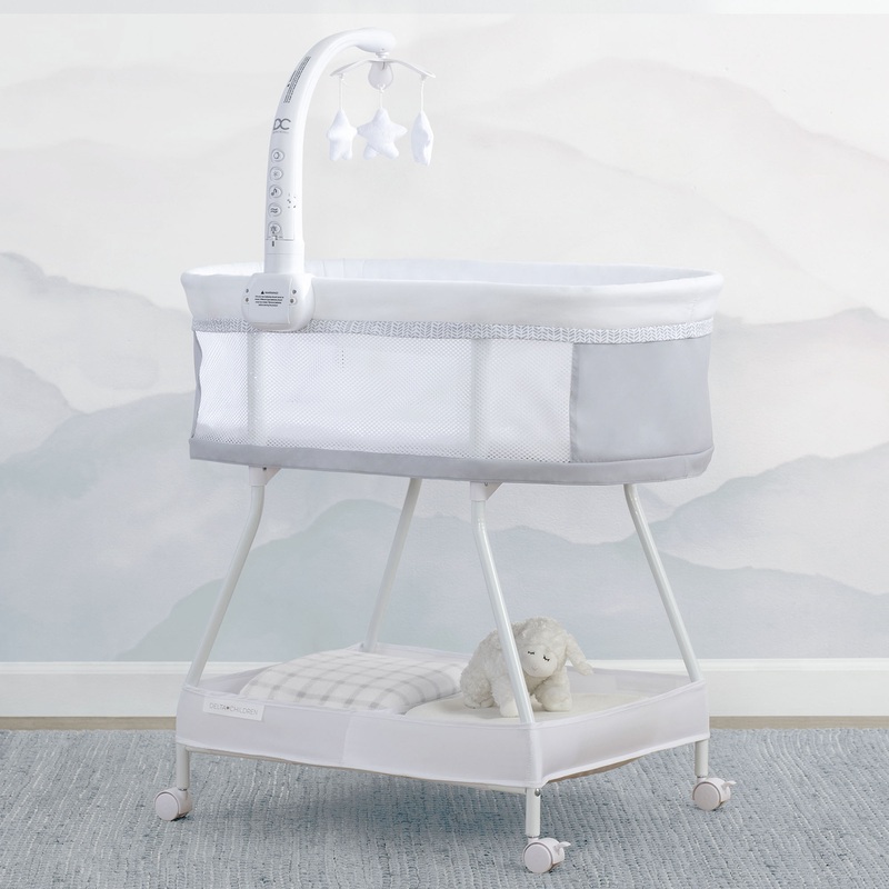 Help your baby sleep better with the Sweet Slumber Bassinet by Delta Children! The attached electronic mobile features spinning toys, a soft-glow nightlight, soothing sounds, vibrations and twinkle lightseverything you and your newborn need. A breathable m