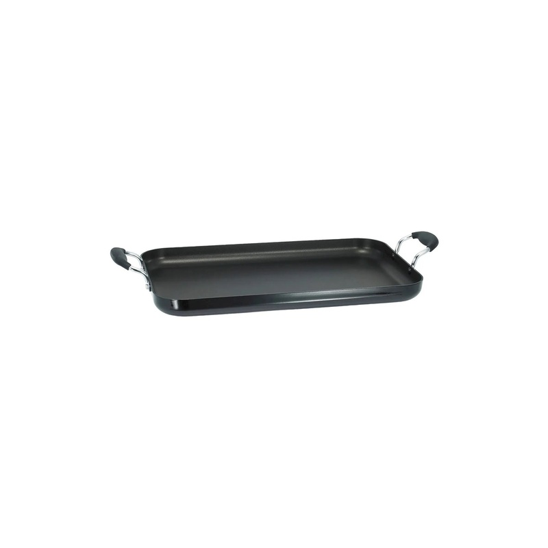 Prepare stovetop meals for the whole family with the Double Burner Griddle from T-Fal. Made of heavy-gauge aluminum, this black double burner griddle features a nonstick coating and comes with stay-cool silicone handles for safer use, while its larger size fits nicely on two burners to prepare big batches of food. Complete with a shiny, scratch-resistant surface, it’s dishwasher-safe for easier cleanup.