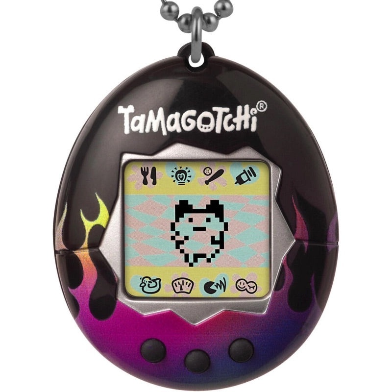 - The shell has colorful flames on black with white ‘Tamagotchi’, silver frame and black buttons, and updated logo.