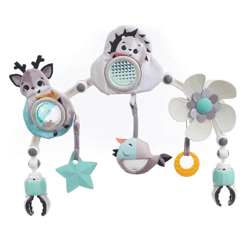 “This colorful stroller arch stimulates your newborn’s vision while providing an ideal way to practice hand-eye skills. The arch is easy to attach to a variety of strollers with its universal clip.”