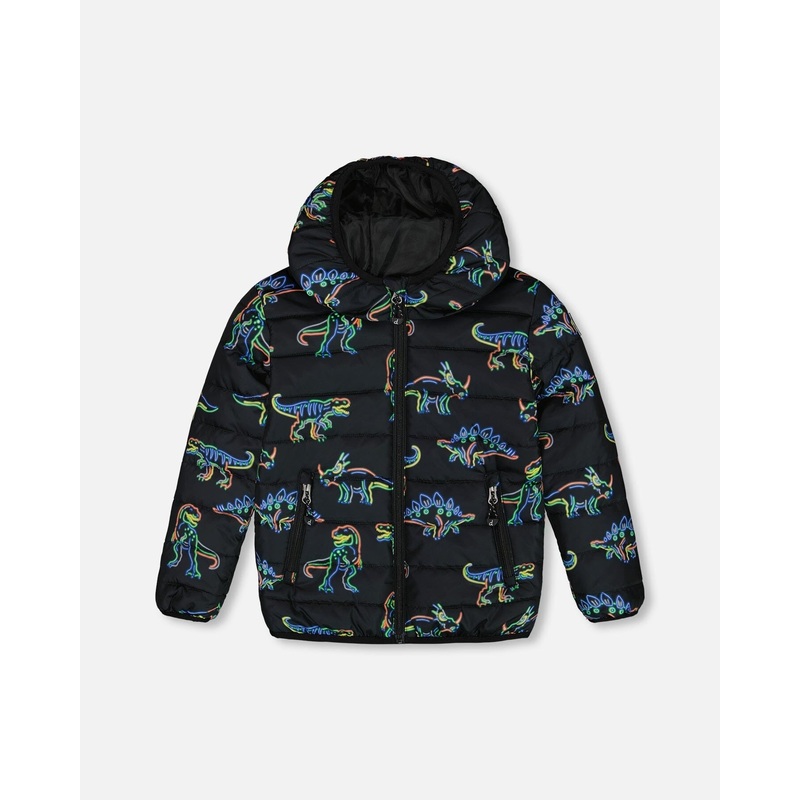 Our Quilted Jacket Black Printed Neon Dino is made for chilly days that call for an outer layer but don’t require a heavy down coat. Detailed with an eye-catching allover dinosaur print, this jacket features horizontal quilting, an attached hood, a zip front closure, and slant front zipper pockets. Team it with a matching hat for a super cool look!