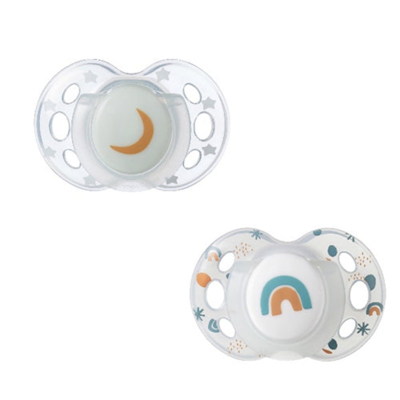 - Soothe baby with this pack of two symmetrical orthodontic silicone soothers from Tommee Tippee.