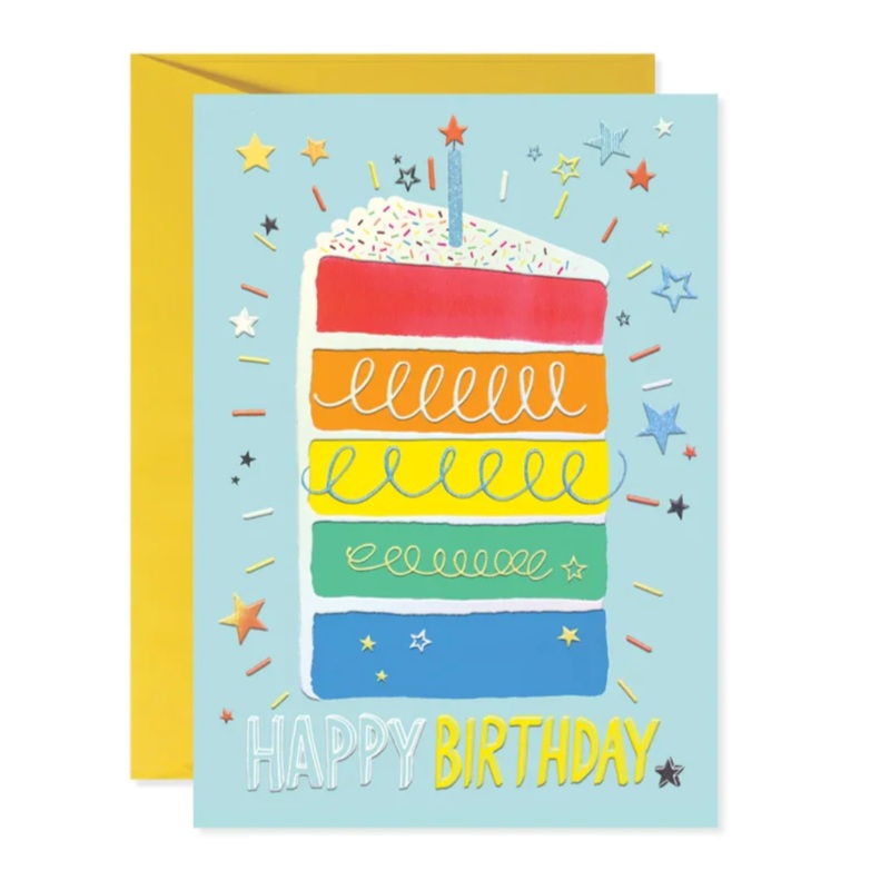 This delicious birthday card features an illustrated multicolor slice of birthday cake with swirls of color and little stars against a baby blue background! Clear holographic foil and embossed accents add an extra pop of style to this playful card!