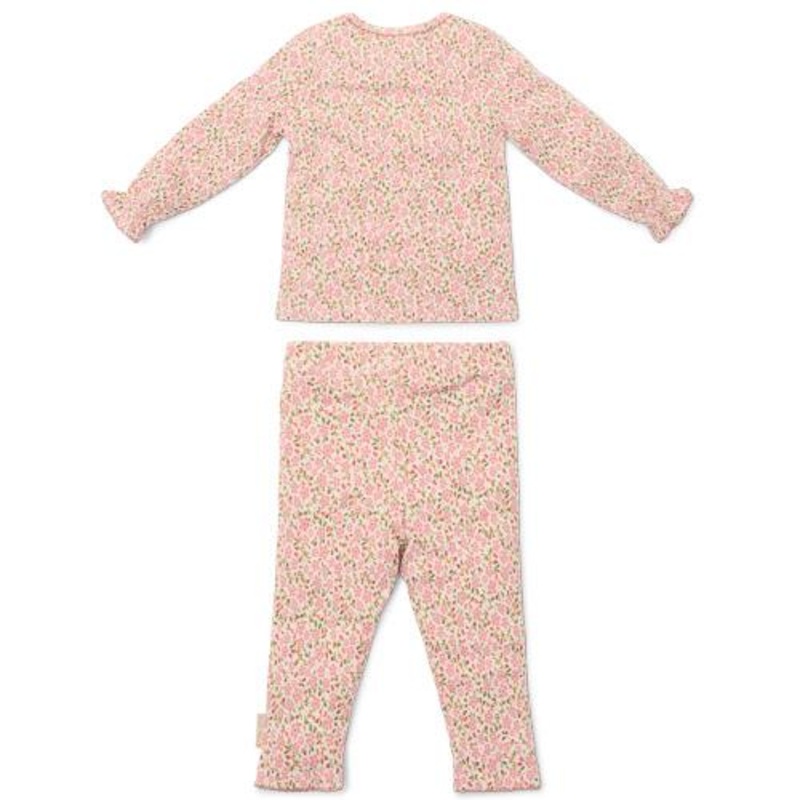 Flower Power Pyjamas! Boost bedtime style with these Fairy Floral two-piece pyjamas. Crafted from comfortable ribbed material, these pyjamas feature a lovely pink print covered in cute little flowers. The sleeves are finished with delicate ruffles and have a small stitched trim along the edge, enhancing their charm. Crafted from organic cotton and designed to match the bed linen, these pyjamas are not only stylish but also soft and comfortable for your babys skin. Packed in a beautiful box, this set makes for a lovely gift. Available in sizes 62/68, 74/80, 86/92 and 98/104.