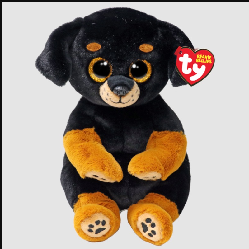 BLACK ROTTWEILERRandi woofs you! This rottweiler has a gorgeous black and orange coat. Randi's little eyebrows and embroidered paws are too cute!Made with super soft VelveTy fabricSparkly glitter eyesAn adorable black rottweilerUnique shaped sitting attent