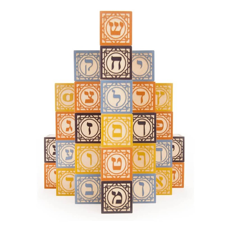 Explore the Hebrew language and teach heritage with this 28-block set. Enjoy the filigree of interlacing triangles that surrounds two embossed letters on each block. Two other sides show one number and one animal paired with their Hebrew translations. The remaining sides contain more hand-crafted letters, including the five soffit forms.