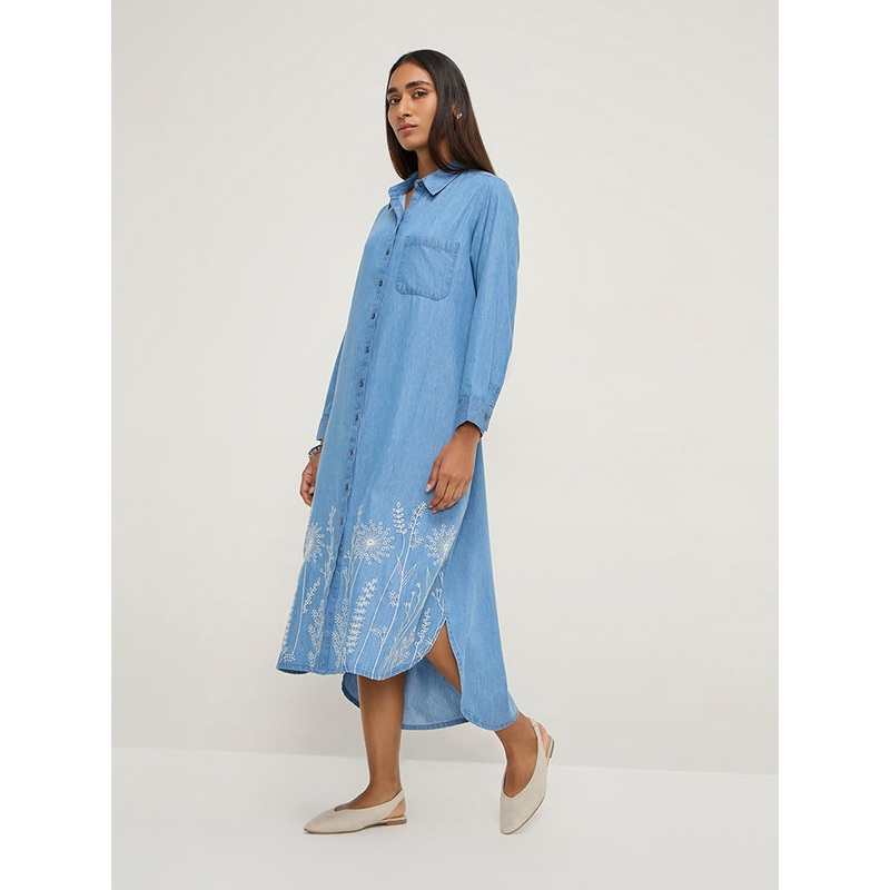 Utsa lunches this blue denim shirt dress featuring delicate floral embroidery. Made from a blended cotton fabric, it is fitted with a classic collar which extends to a button placket and full sleeves. The chest pocket lends a stylish finish.