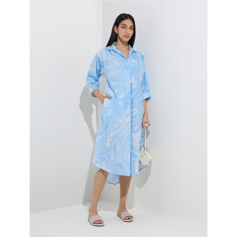 Utsa Blue Marble Printed Cotton High-Low Straight Dress