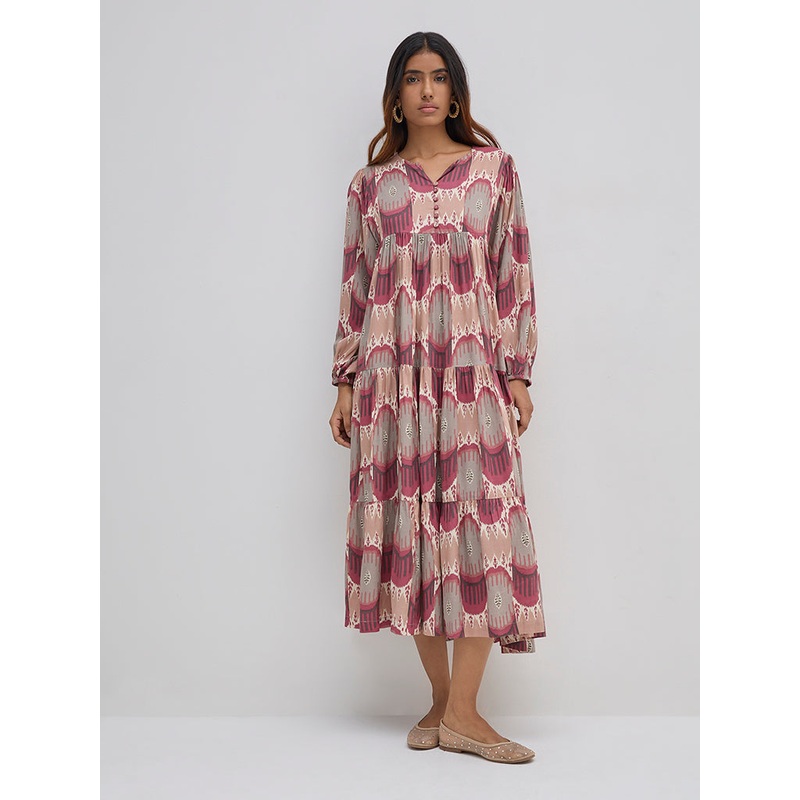 Utsa Dusty Pink Ikat Printed Tiered Dress