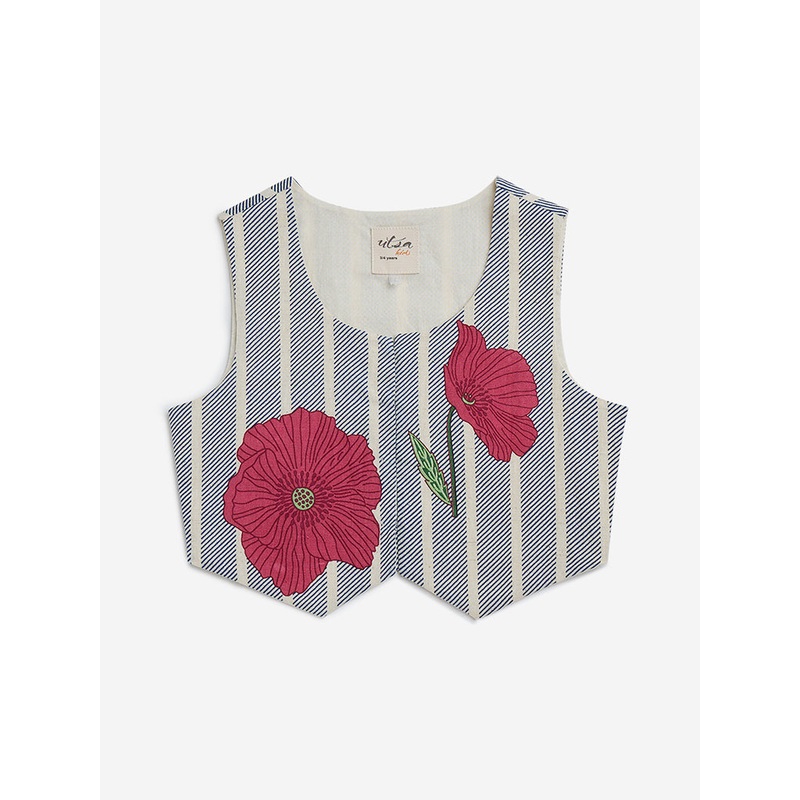 Utsa Kids launches this blue top adorned with stripes and floral prints. The soft and breathable fabric garment carries a round neck leading to a concealed button placket and sleeveless cut.