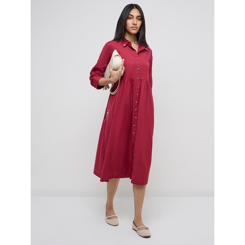 This magenta shirtdress by Utsa spotlights dainty floral embroidery. Crafted from a breathable fabric in a fit-and-flare silhouette, it comes fitted with a spread collar that extends to a button placket and three-quarter sleeves. The pockets lend practical