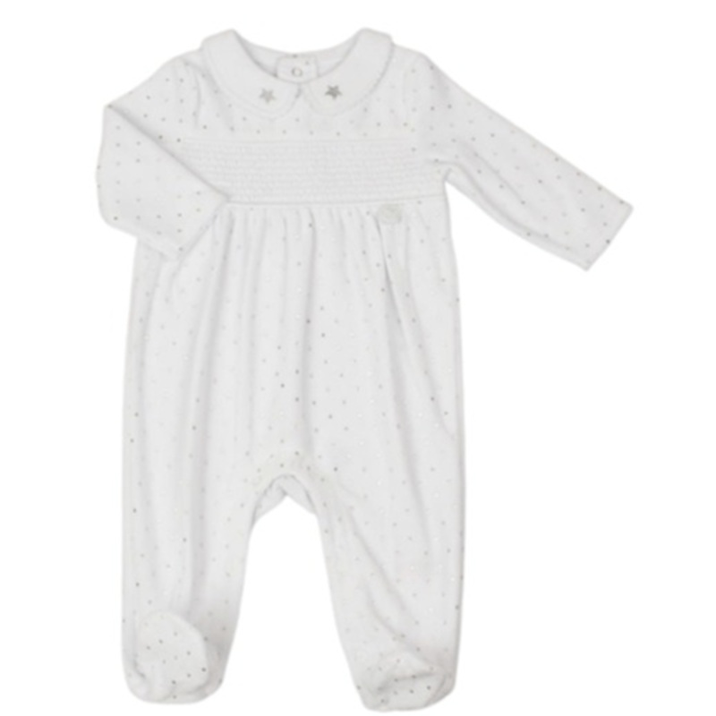 Back and leg fastening velour all-in-one with smocked panel, woven Peter pan collar, and foil/embroidered star design. Perfect unisex velour sleepsuit.