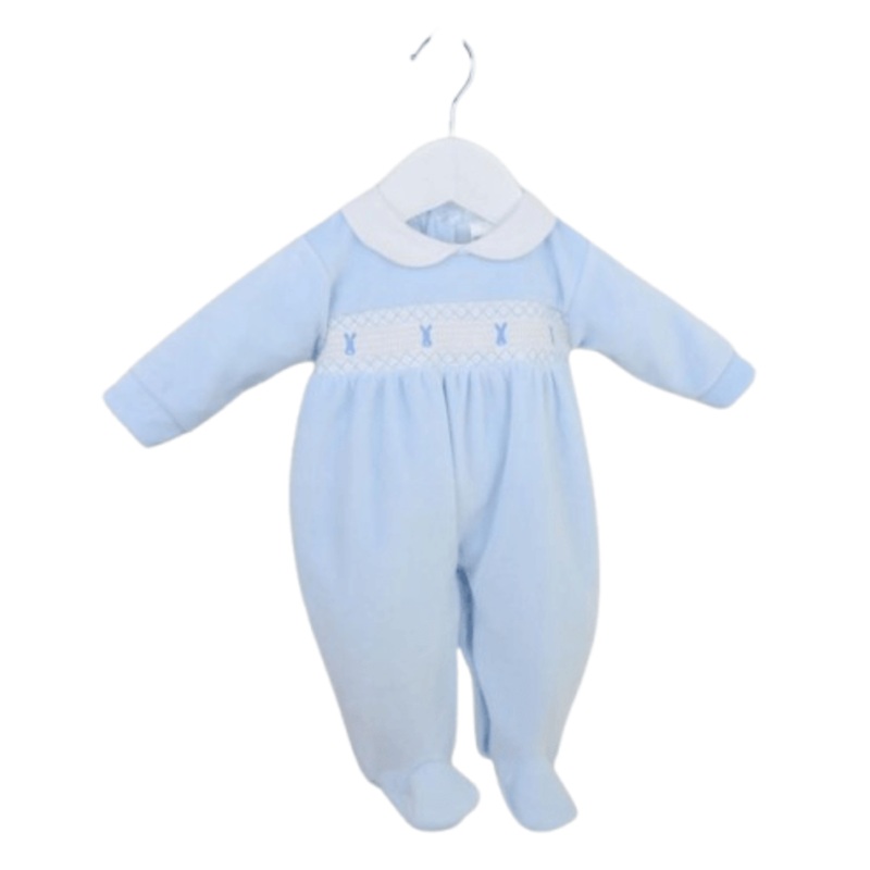 This stunning blue baby romper is in super soft velour, with a crisp white smocked panel and bunny embriodary.