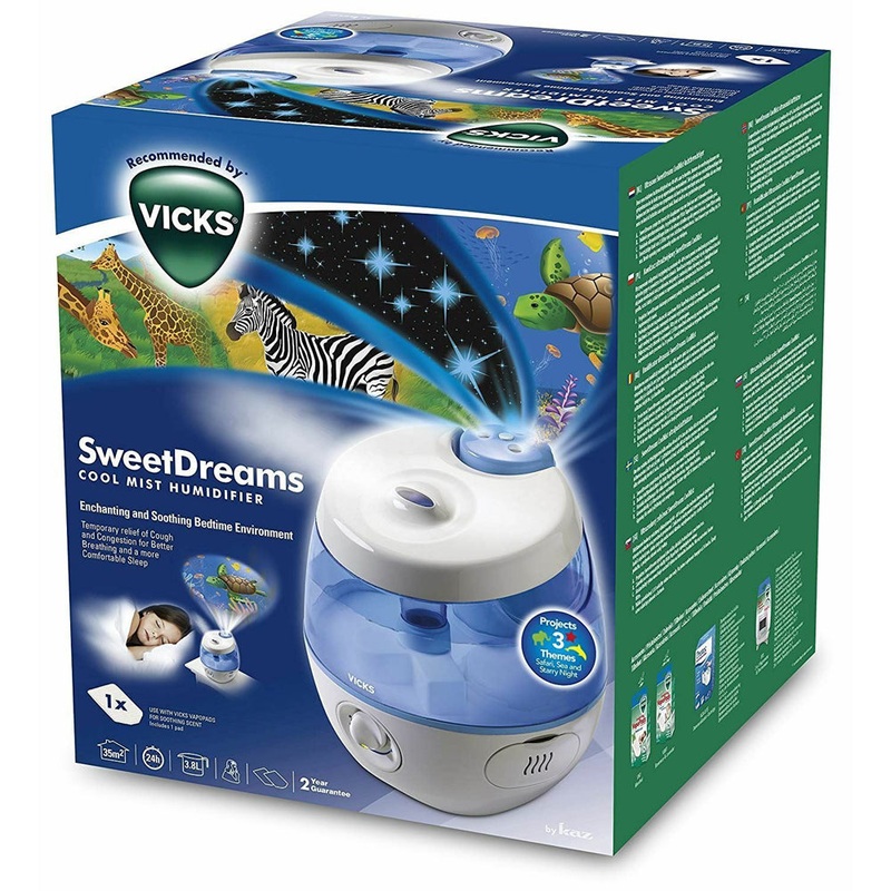 The Vicks SweetDreams Cool Mist Humidifier is suitable for use with Vicks VapoPads Menthol or Rosemary & Lavender (up to two can be used simultaneously) for extra soothing comfort.Suitable for room size 35m.Creates a soothing bedtime environment while prov