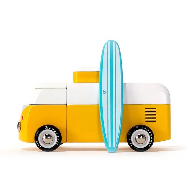 The Beach Bus is back! Now officially licensed by VW – check out the shiny emblem on the front. This iconic Volkswagen Type 2 comes with a magnetic camper top and surf board.