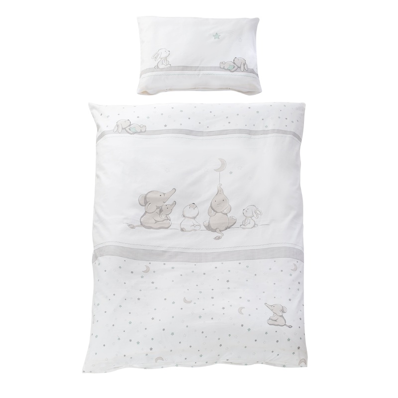 Die Wendebettwsche aus der Kollektion ‘Sternenzauber’ ist ein Hingucker im Kinderzimmer. Beim liebevoll gestalteten Design Sternenzauber erzhlen sich Hschen, Br und Elefanten eine Gute-Nacht-Geschichte.