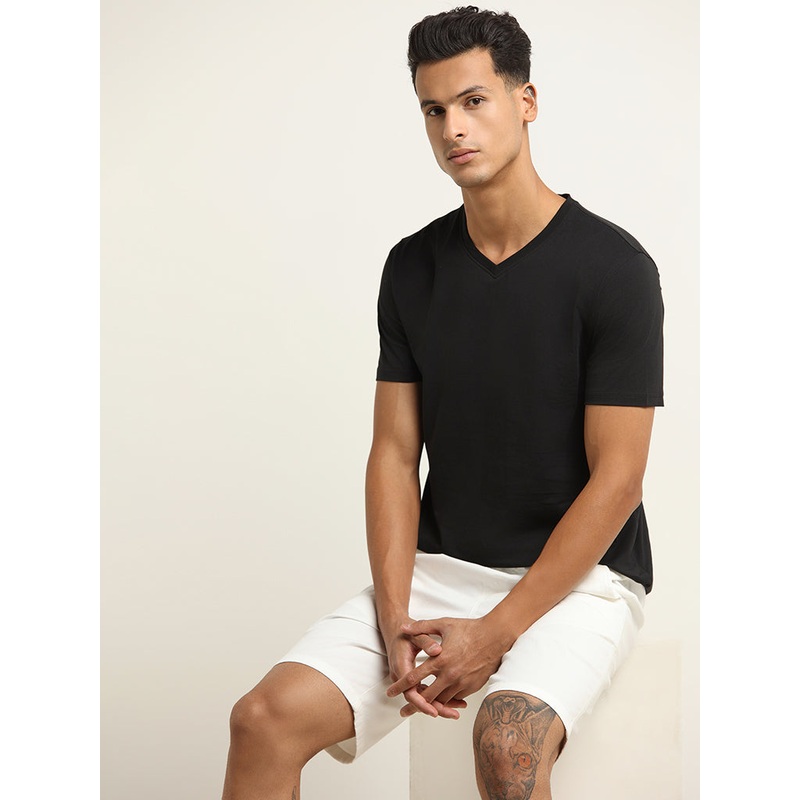 Stylishly embrace perfection with the WES Casuals t-shirt. This amazing piece, crafted from sleek black fabric, features a plain design, a flattering V-shaped neckline, and half sleeves for a contemporary touch.