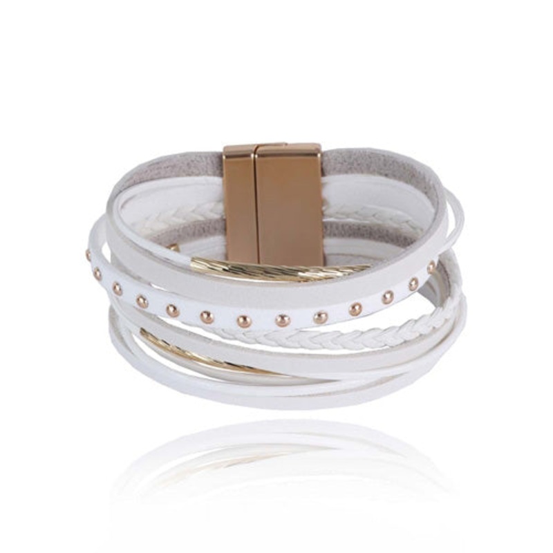 A beautiful and stylishwhite leather eco-bracelet isexactly what you need this season. This wonderful product will be a great complement for both casual and formal stylizations. This product was made of high-quality eco-leather and hypoallergic stainless steel.