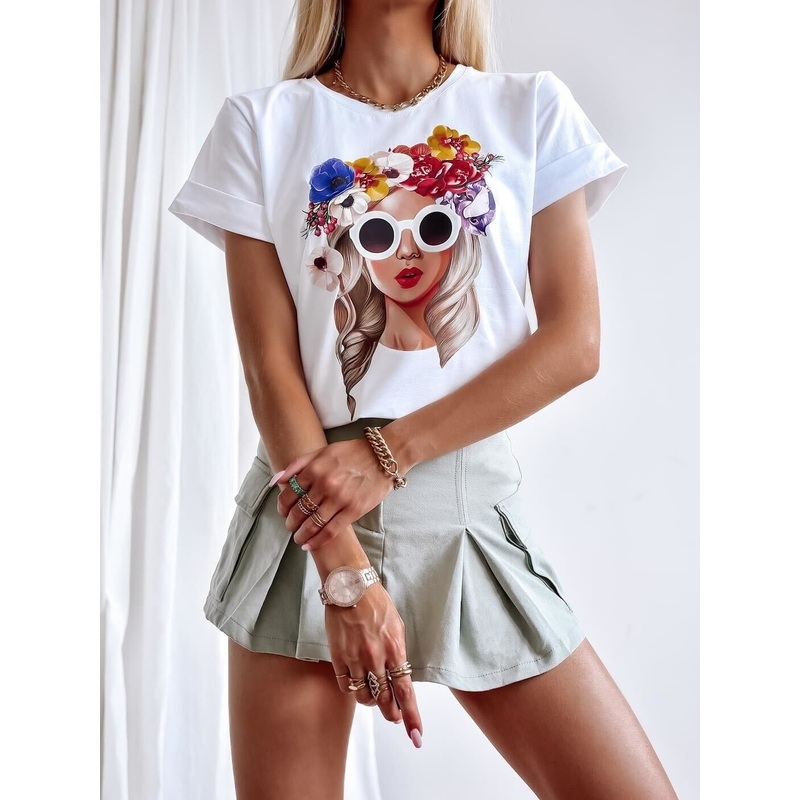HXS65230684290White T-Shirt with Woman with Flowers Print | FL-67