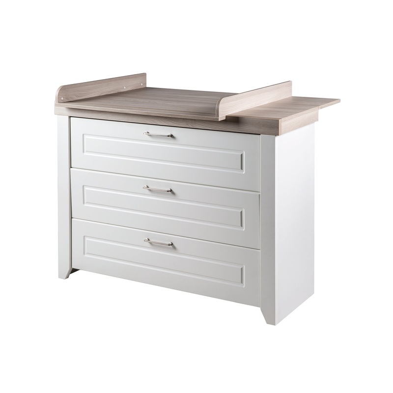 Die roba Wickelkommode mit Wickelansatz ‘Felicia’ macht mit ihrer angenehmen Wickelhhe von 90 cm die Babypflege fr Eltern und Baby zum Vergngen. Die gepolsterten roba Wickelauflagen in der Gre 85 cm x 75 cm verwandeln die Wickelkommode in einen kuscheligen Wickelplatz im Babyzimmer. Die Schubladen bieten Stauraum fr Wickelutensilien, so haben Sie bei der Babypflege alles schnell griffbereit. Die roba Wickelkommode mit Wickelansatz ist ein wahres Multitalent und leistet Ihnen weitere Jahre gute Dienste. Die stabile Wickelkommode bietet sich als erhhter Sitzplatz fr Ihr Kindergartenkind an, damit Sie in einer bequemen Stehposition mhelos beim Anziehen helfen knnen. Spter entpuppt sich der Wickelplatz als Kommode in Ihrem Wohn- oder Kinderzimmer. Die Wickelkommode mit edlen, silberfarbenen Metallgriffen und ohne sichtbare Schrauben zhlt zu unseren breiten Varianten. Mit weiteren Kindermbeln aus der Serie ‘Felicia’ lsst sich ein komplettes, stilvolles Kinder- oder Babyzimmer einrichten. Die Wickelkommode ist in Deutschland entwickelt und entspricht den aktuellen Sicherheitsstandards nach EN 12221 1+2:2008 + A1:2013. Die Wickelkommode ‘Felicia’ wurde in der EU produziert und ist montagefreundlich. (HxB): 98 x 120 cm, Tiefe mit/ohne Wickelansatz: 75/42 cm, Wickelhhe 90 cm. Korpus im Dekor ‘Wei’ und Front im Dekor ‘Canadian White’. Deckplatte im Dekor ‘Luna Elm’.