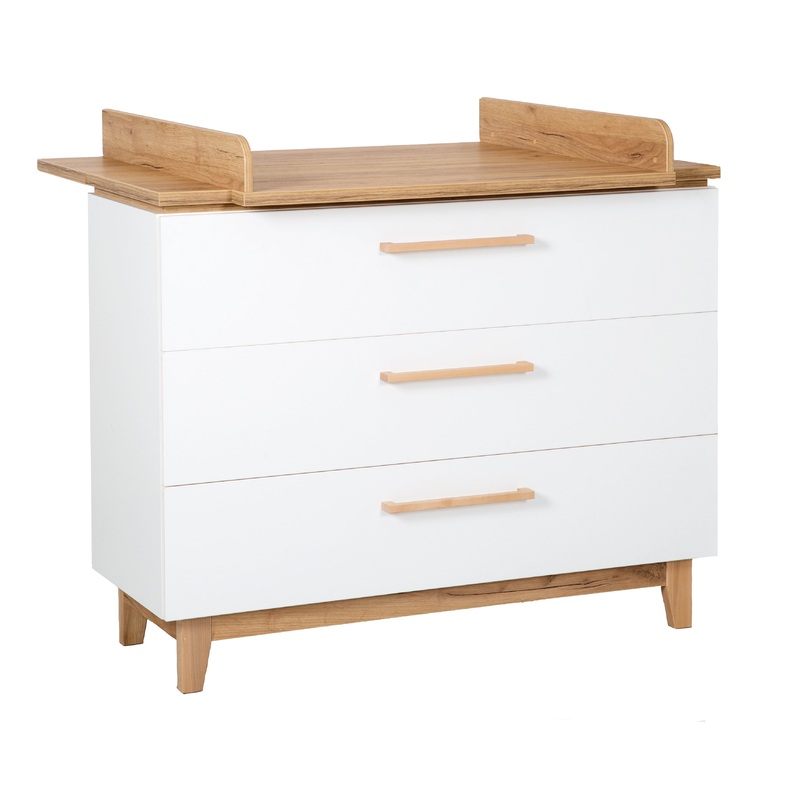 Die roba Wickelkommode mit Wickelansatz ‘Finn’ macht mit ihrer rckenschonenden Wickelhhe von 94 cm die Babypflege fr Eltern und Baby zum Vergngen. Die abnehmbare Wickelplatte lsst sich rechts, mittig oder links oben am Wickeltisch montieren. Die gepolsterten roba Wickelauflagen in der Gre 85 cm x 75 cm verwandeln die Wickelkommode in einen kuscheligen Wickelplatz im Babyzimmer. Fr sanftes Schlieen der 3 Schubladen sorgt die Schubladendmpfung der eingebauten Soft Close-Technik. Die oberste Schublade des Wickeltisches lsst sich komplett herausziehen und bietet Stauraum fr Wickelutensilien. Durch den Vollauszug der oberen Schublade haben Sie bei der Babypflege alles schnell griffbereit. Eine praktische Ergnzung zur Wickelkommode, ist das passende Wandregal aus der Serie ‘Finn’ (Art. Nr.: 1511792). Mit weiteren Kindermbeln aus der Serie ‘Finn’ lsst sich ein stilvolles Kinder- oder Babyzimmer einrichten. Die roba Wickelkommode mit Wickelansatz ist ein wahres Multitalent und leistet Ihnen weitere Jahre gute Dienste. Die stabile Wickelkommode bietet sich als erhhter Sitzplatz fr Ihr Kindergartenkind an, damit Sie in einer bequemen Stehposition mhelos beim Anziehen helfen knnen. Spter entpuppt sich der Wickelplatz als Kommode in Ihrem Wohn- oder Kinderzimmer. Die Wickelkommode mit hochwertigen Massivholzgriffen und ohne sichtbare Schrauben zhlt zu unseren breiteren Varianten. Die Wickelkommode ist in Deutschland entwickelt und entspricht den aktuellen Sicherheitsstandards nach EN 12221 1+2:2008 + A1:2013. Die Wickelkommode ‘Finn’ wurde in der EU produziert und ist montagefreundlich. Zustzlich ist sie eph zertifiziert und trgt das Qualittssiegel blauer Engel, das garantiert, dass alle verwendeten Materialien hchste Ansprche an Umwelt-, Gesundheits- & Gebrauchseigenschaften erfllen. (HxB): 104 x 117,5 cm, Tiefe mit/ohne Wickelansatz: 78/41 cm, Wickelhhe 94 cm. Korpus und Front wei. Sockelrahmen und Deckplatte im Dekor ‘Goldeiche’.
