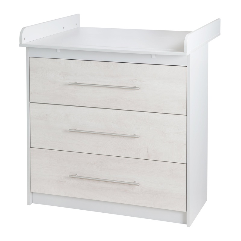 Die roba Wickelkommode ‘Maren 2 im Trenddekor gekalkte Eiche, lichtgrau mit hochwertigen Edelstahlgriffen bietet in ihren drei Schubladen reichlich Stauraum und Sie haben bei der Babypflege alles griffbereit.