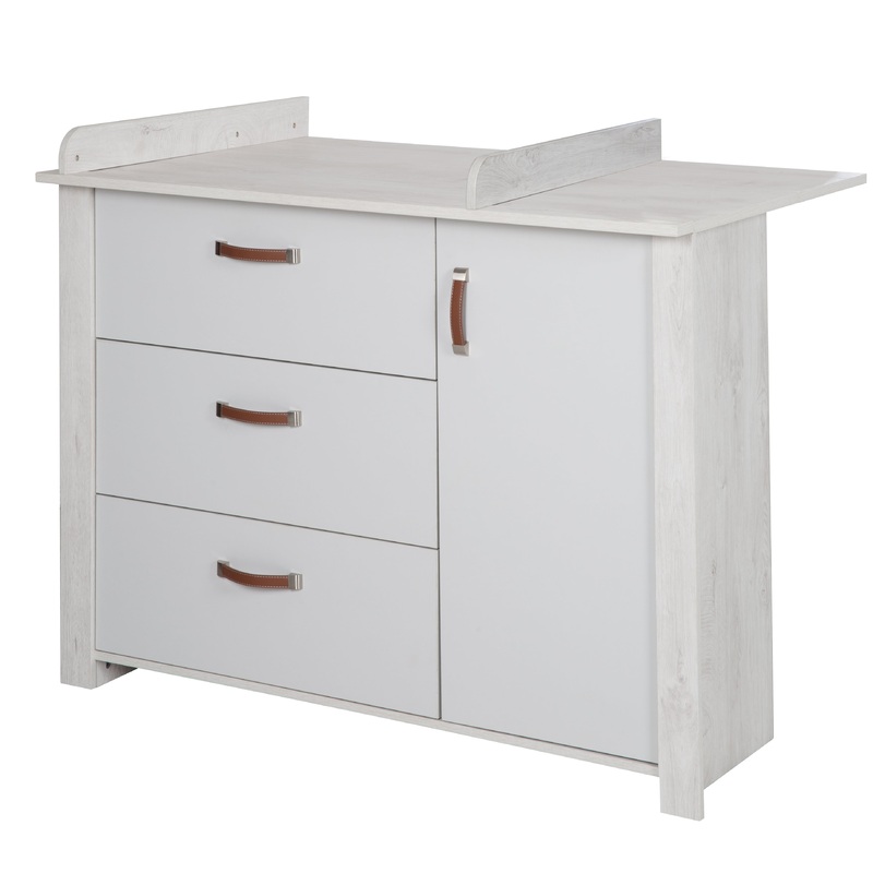 Die roba Wickelkommode mit Wickelansatz ‘Mila’ im trendigen Dekor und modernen, ruhigen Farben macht mit ihrer Wickelhhe von 90,5 cm die Babypflege fr Eltern und Baby zum Vergngen. Die abnehmbare Wickelplatte lsst sich rechts, mittig oder links oben am Wickeltisch montieren. Die gepolsterten roba Wickelauflagen in der Gre 85 cm x 75 cm verwandeln die Wickelkommode in einen kuscheligen Wickelplatz im Babyzimmer. Fr sanftes Schlieen der 3 Schubladen sorgt die Schubladendmpfung der eingebauten Soft Close-Technik. Der Wickeltisch bietet mit seiner durchdachten Einteilung viel Stauraum fr Wickelutensilien. So haben Sie bei der Babypflege alles schnell griffbereit. Eine praktische Ergnzung zur Wickelkommode, ist das passende Wandregal (Art. Nr.: 1511803). Die roba Wickelkommode mit Wickelansatz ist ein wahres Multitalent und leistet Ihnen weitere Jahre gute Dienste. Die stabile Wickelkommode bietet sich als erhhter Sitzplatz fr Ihr Kindergartenkind an, damit Sie in einer bequemen Stehposition mhelos beim Anziehen helfen knnen. Spter entpuppt sich der Wickelplatz als Kommode in Ihrem Wohn- oder Kinderzimmer. Die Wickelkommode mit modernen Griffen in Lederoptik und ohne sichtbare Schrauben zhlt zu unseren breiteren Varianten. Mit weiteren Kindermbeln aus der Serie ‘Mila’ lsst sich ein stilvolles Kinder- oder Babyzimmer einrichten. Die Wickelkommode ist in Deutschland entwickelt und entspricht den aktuellen Sicherheitsstandards nach EN 12221 1+2:2008 + A1:2013. Die Wickelkommode ‘Mila’ ist montagefreundlich. HxB: 98,5 x 126 cm, Tiefe mit/ohne Wickelansatz 75/39,5 cm, Wickelhhe: 90,5 cm. Korpus und Rahmen im Trenddekor ‘weigekalkte Eiche mit Echtholzhaptik’. Fronten in modernem ‘Lichtgrau’.