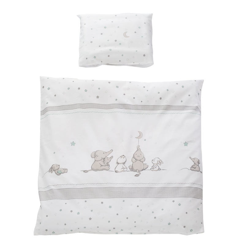 Diese 2-teilige Wiegenbettwsche aus der Kollektion ‘Sternenzauber’ ist im oberen und unteren Bereich der Bettdecke mit einem bezaubernden Sternenhimmel in grau, wei und mintfarben bedruckt. In der Mitte der Bettwsche erzhlen sich Hschen, Br und Elefanten eine Gute-Nacht-Geschichte, whrend sie den Sternenhimmel bewundern. Die roba Wendebettwsche ist ein Highlight im Babyzimmer. Die hochwertige 2-teilige Wiegenbettwsche besteht aus einem Kissenbezug 40 x 35 cm und einem Bettbezug 80 x 80 cm und ist aus hautfreundlicher & atmungsaktiver Baumwolle gefertigt. Die Wiegenbettwsche sorgt fr ein gesundes Schlafklima und garantiert besten Schlafkomfort. Alle verwendeten Materialien der Wendebettwsche sind schadstoffgeprft und zertifiziert. Zustzlich werden sie regelmig whrend der Herstellung berprft. Das Wiegenset aus 100 % Baumwolle ist in der Maschine waschbar und trocknergeeignet. Zu diesem 2-teiligen Wiegenset gibt es weitere wunderschne Accessoires aus der roba Kollektion ‘Sternenzauber’.