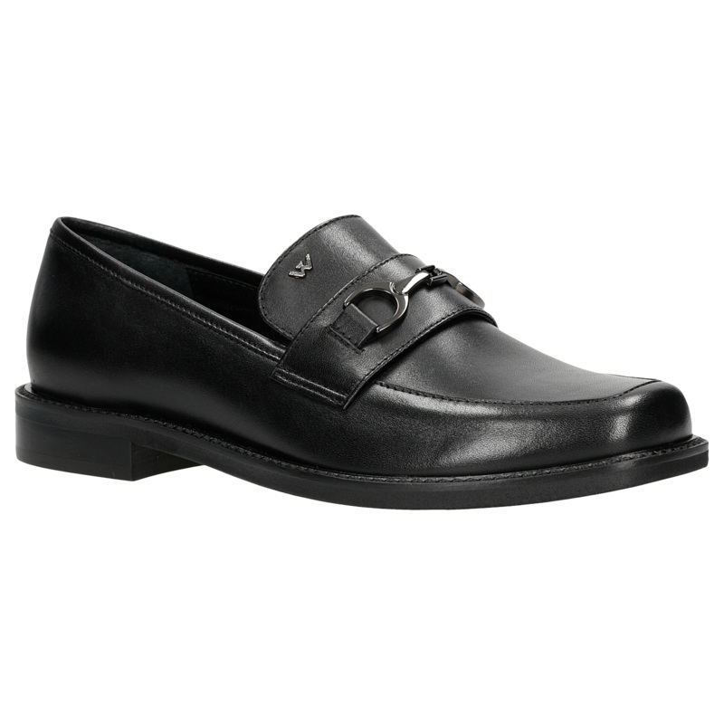 Beautiful black loafers with black Wojas logo made of high-quality natural leather. These shoes have been designed in accordance with the latest fashion trends, which makes them an essential element of every woman’s wardrobe. The product is also very comfortable and durable.