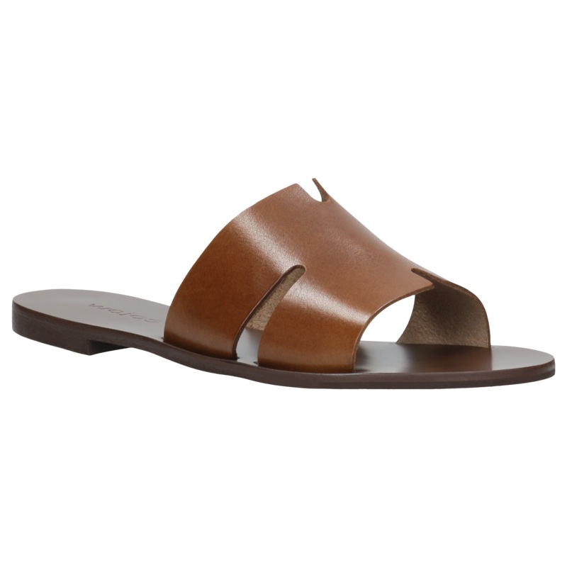 Beautiful light brown slide sandals with golden detail made of high-quality natural leather. These shoes have been designed in accordance with the latest fashion trends, which makes them a great addition to your outfit on warmer days.