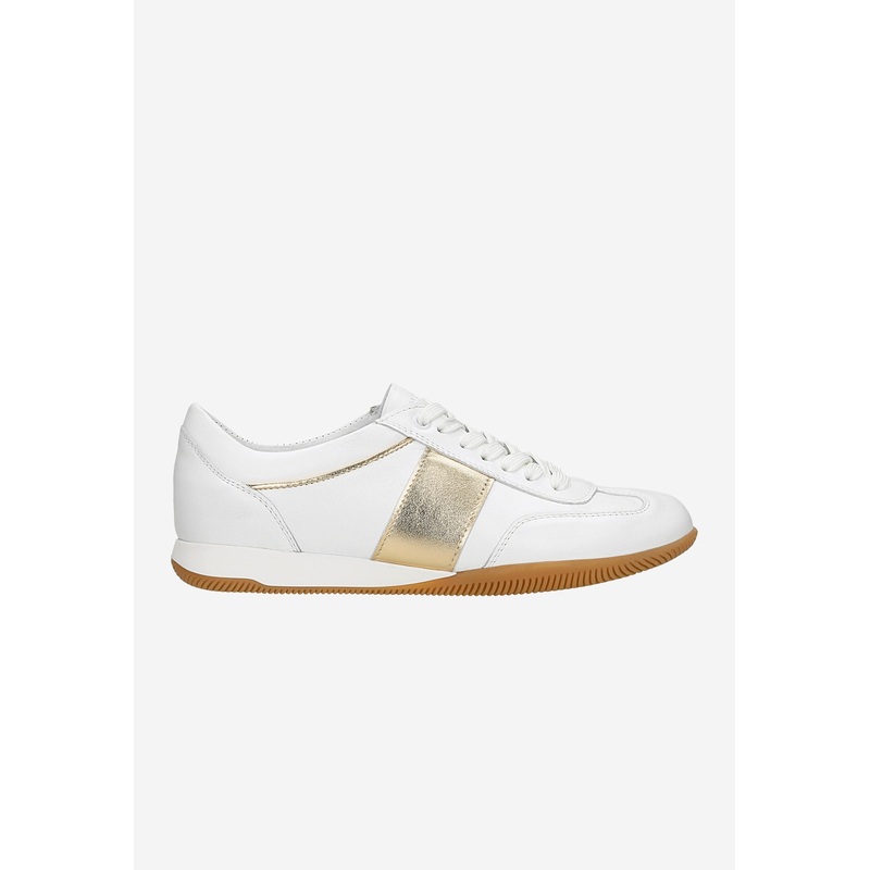 Beautiful white and golden sneakers made of high-quality natural leather. These shoes have been designed in accordance with the latest fashion trends, which makes them an essential element of every woman’s wardrobe. This product is a great choice for women who value comfort.