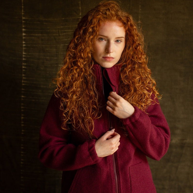 This organic boiled merino wool coat is soft, warm and very cosy. With a straight cut, raglan sleeves, a high collar and two extra big front pockets, it is ideal for Autumn and Winter days. Comes with two drawstrings at the bottom allowing for an adjustable fit. This is a great throw on style that will keep you protected from the elements. Boiled wool has great weatherproof properties and will even withstand a light rain shower.