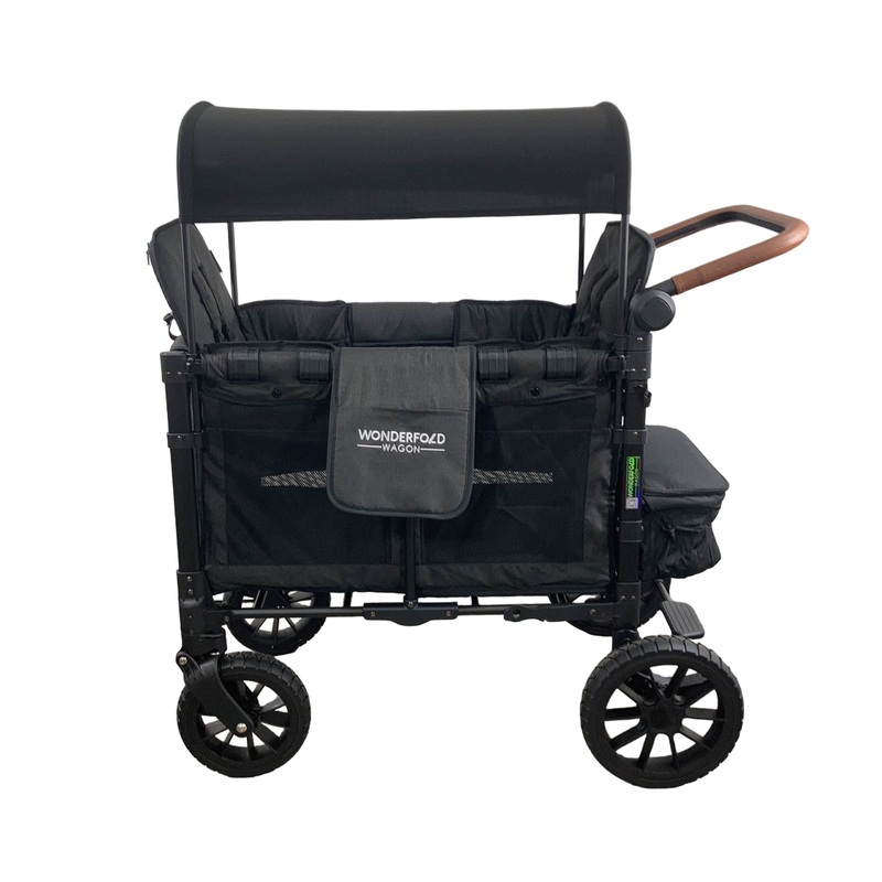 “This updated wagon is amazing! It can hold up to 2 kids and includes 5 point magnetic harnessed seats with a slidable/removable large canopy. If you want to use this wagon without seats, the seats are removable. This wagon has great updated features such as a front zipper for easy access, an adjustable push handle with vegan leather, a 1 step foot brake, all-terrain XL tires, and an amazingly small fold. This wagon holds up to 200 pounds and 45 pounds for each seat.”